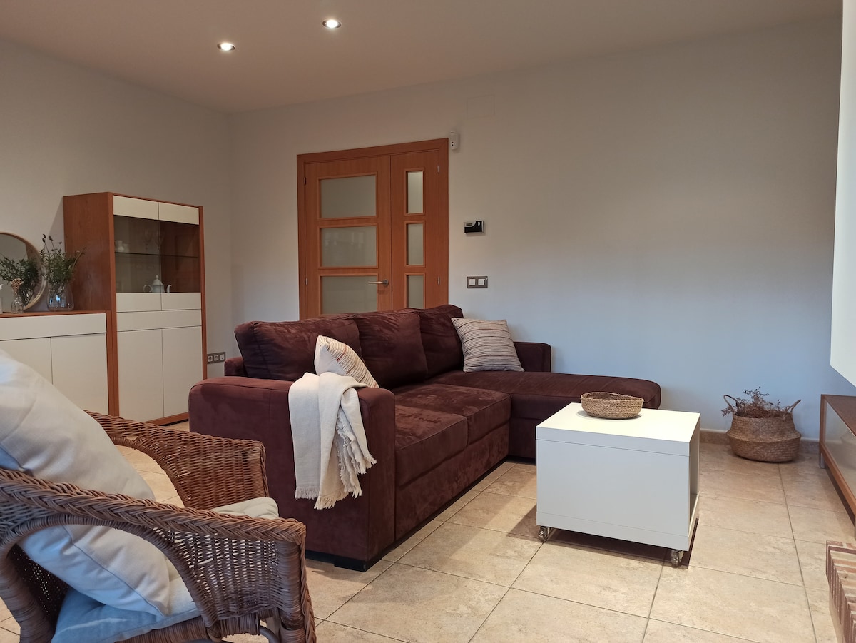 Pet Friendly / Bike friendly . Bonica acollidora casa, per gaudir d'unes bones vacances.A la zona del porxo hi ha una taula per poder dinar o sopar sota les estrelles i butaques per fer una sobre taula. Disposa de barbacoa.A la part posterior de la casa, es podran relaxar fent un aperitiu o tombats a les còmodes tombones.A l'interior hi ha 2 habitacions amb amplis armaris, al menjador sofà, tv i aire condicionat. La cuina disposa de rentaplats,cafetera dolce gusto, melita i microones.