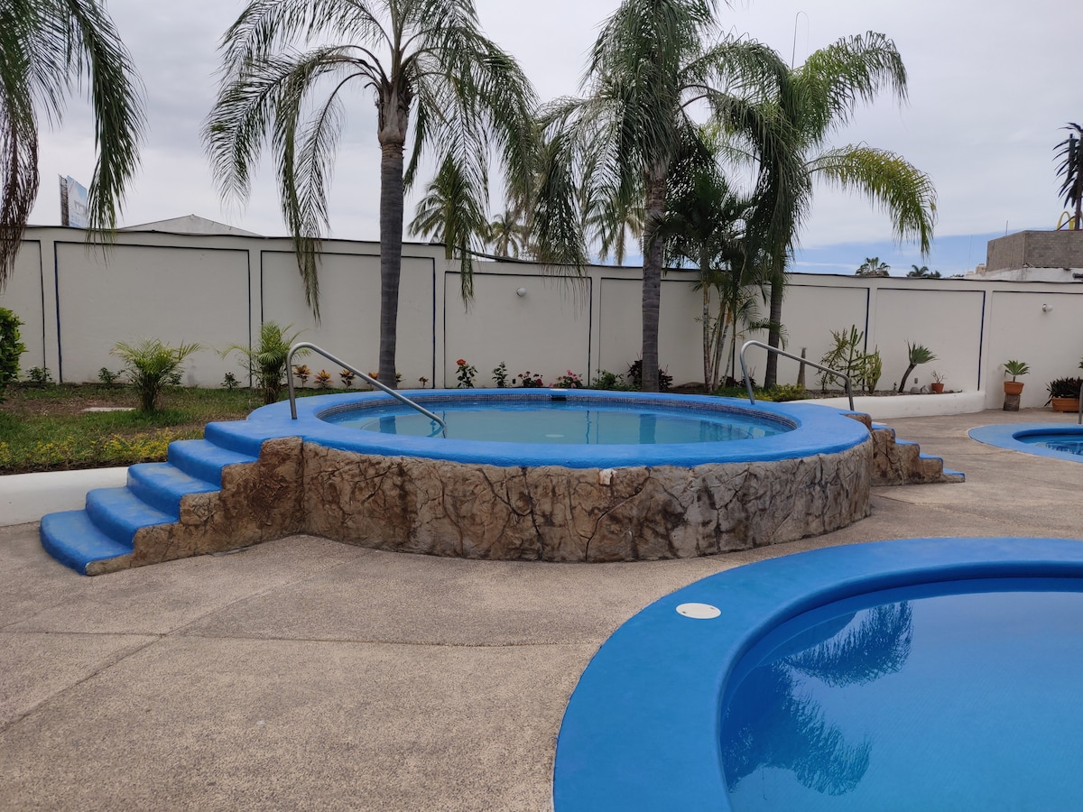 Visiting Mazatlán? Great! We have a superb place. Apartment 2 has what you need: ✔️ First-floor location 🔒 Inside a secure building, accessible by codes 🛏️ Queen bed for 2, max 4 if you rent an inflatable mattress ($300 MXN) 🚽Bathroom 🌬️ Minisplit (AC unit) 🥄 Equipped kitchen 📺 Smart TV 🚀 Internet Plus, there is a terrace with a pool, grill, and bar lounge available on the 3rd floor. 5 min. from the Golden Zone (Zona Dorada) and close to restaurants, Soriana, and Walmart.