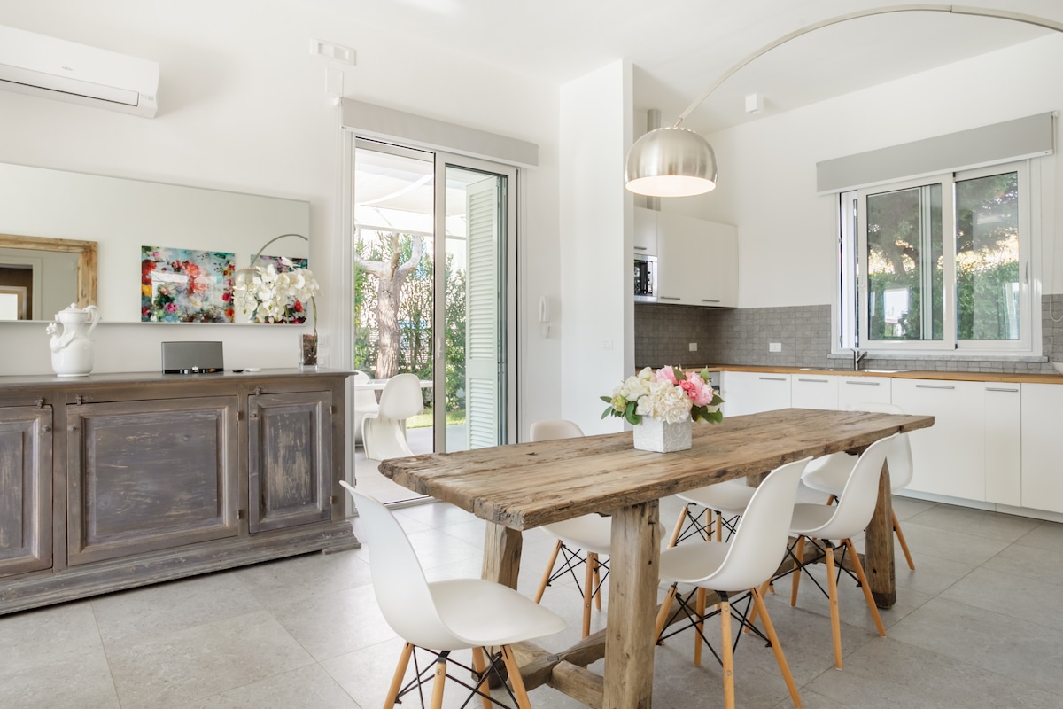 This seafront villa, immersed in the natural oasis of the Porto Selvaggio Park, between the countryside and the Mediterranean scrub will be a unique experience of relaxation and beauty in total privacy. Sea, countryside and a large Mediterranean garden will surround you with colors and scents. The central body of the house and a small guesthouse overlook a Arab courtyard with a lemon tree and a small pool . From the equipped terrace you can admire the sunsets and the starry skies of Salento.