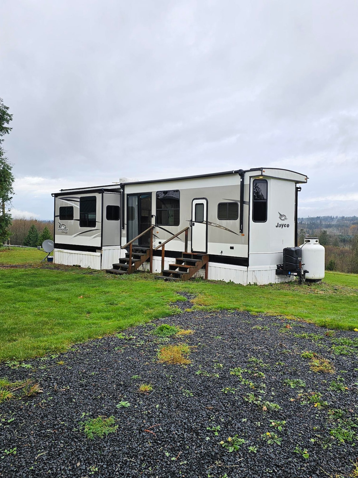 Keep it simple at this peaceful and centrally-located place. Cascade Mountains to the Pacific Ocean, Portland to Seattle . Nestled in the woods, perfect spot for whatever you have in mind. Fish, Hunt, Hike, Ski, Shop, Antiques, Art, Dine, Festivals, Lakes, Kayaking, Breweries, Wineries. Our quest house is about 600 sq ft. & sleeps 4 adults - 1 queen bed and pull-out sectional. Kitchenette complete with coffeepot, mini fridge, microwave, toaster/air fryer oven, dishes, pots and pans & more.