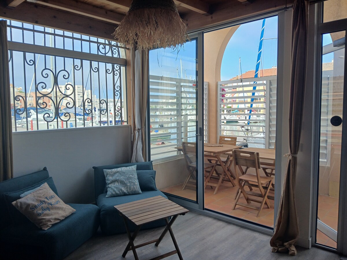 🌞Vous apprécierez la MAGNIFIQUE VUE PORT⛵ 🌊🐳🧜🏄🦀🏖️PLAGE et MER à 5 minutes à pied 👣 Entrée et terrasse privées face au Port et ses Bateaux⛵ la tranquillité & la proximité DE TOUT 10 min.🚶à pied : bar, restaurant, commerce et club nautique Grand T2 de 50m2 Cosy, très Lumineux Chauffage, clim, WIFI Chambre + Espace de vie cocooning + 2e espace nuit+ salon + Terrasse de 15m2 STATIONNEMENT GRATUIT (novembre à fin mars) : Nombreuses places de parking à proximité + Possibilité GARAGE.