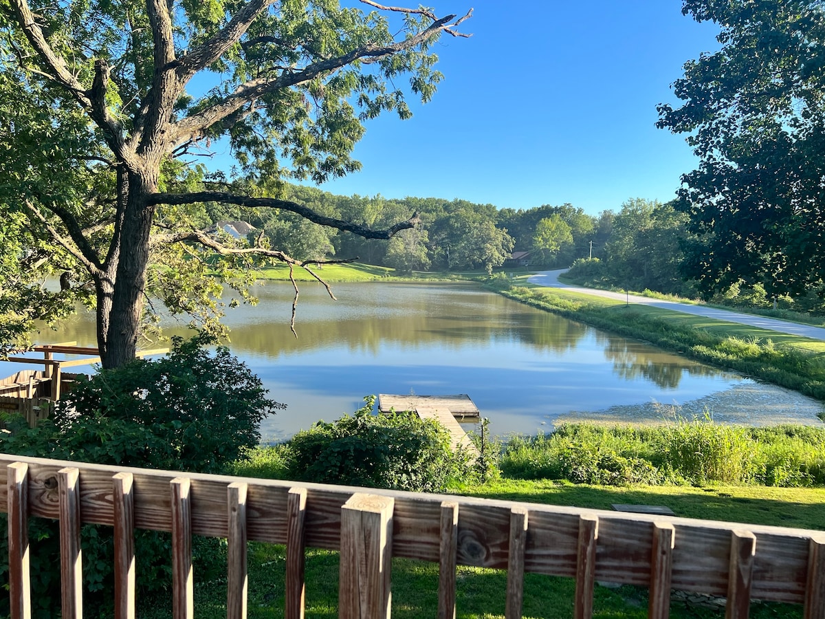 Our beautiful light filled cabin with wood-burning fireplace is perched above our spring-fed 15 acre private lake next to the common outdoor lounge area and sand beach. We have 200 acres of gorgeous property with limestone boulders and hiking trails throughout. The lake is great for swimming, kayaking, stand-up paddle boarding and offers excellent fishing. We are five minutes from downtown Excelsior Springs, Excelsior Springs golf course and 3EX municipal airport. Relax, rejuvenate and play.
