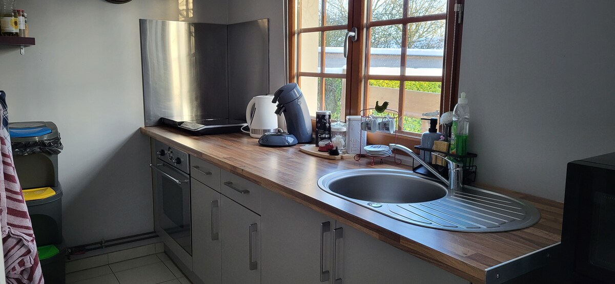 Studio in the second floor in a family home, in the countryside. Calm and tranquility for a pleasant stay. Private bathroom with shower and WC, kitchen area (oven, hotplates, fridge, microwave, coffee maker senseo). Tea,coffee, sugar, salt, pepper, oil, milk, butter provided. Cleaning costs INCLUDED in the base price.