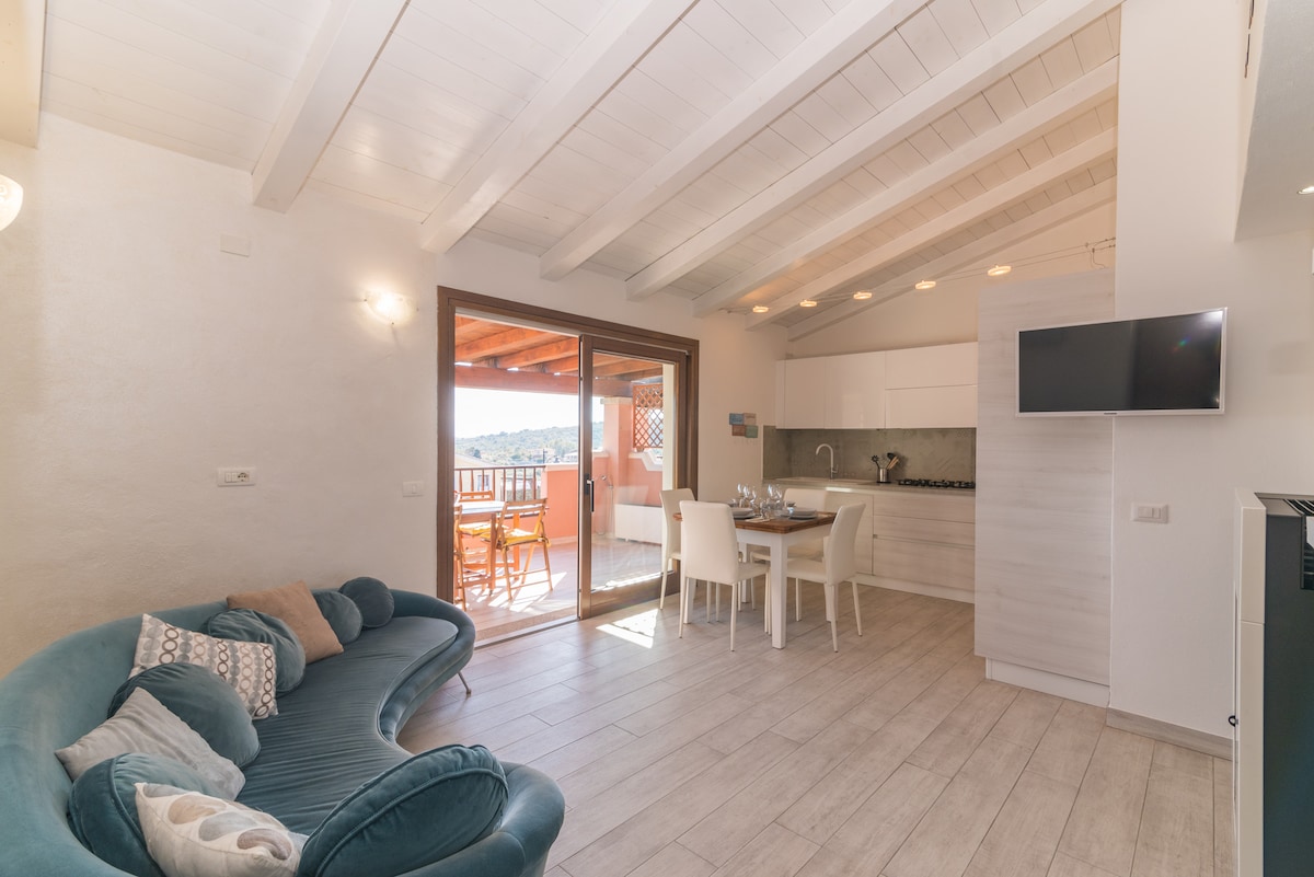 New and very quiet apartment tastefully furnished, with large terrace with beautiful sea view, located a few minutes (700 meters) from the fabulous beaches of Il Pellicano, Pittulongu, Mare Rocce, Bados with services and restaurants nearby. Consisting of a bright living room with equipped kitchen, panoramic terrace, 2 double bedrooms, one of which offers the possibility of having 2 single beds, bathroom with shower and private parking space. Equipped with every comfort, air conditioning, and WiFi.