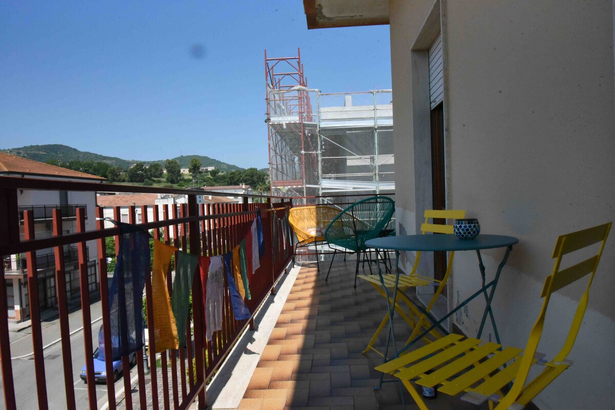 The apartment is in the central area of Policoro, in the large Piazza Ripoli at no. 13. It consists of a large bedroom, a large living room-kitchen, a bathroom and a large balcony. It is equipped with all comforts: kitchen complete with all appliances, including washing machine, radiator heating and hot/cold air conditioning, WiFi network, smart TV: all electric. The roof terrace can be used as a solarium. Look at the photos for details.