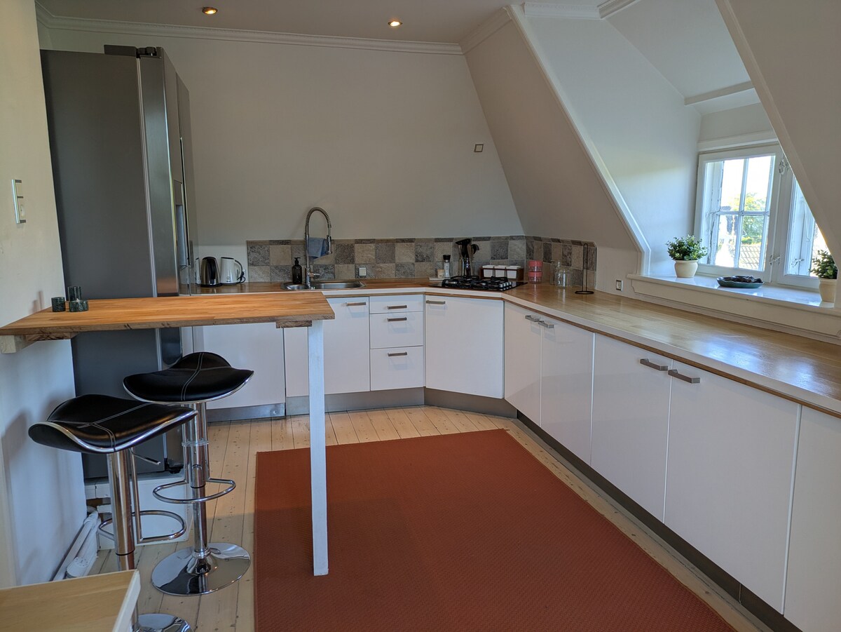 Idyllically located, totally renovated four-wing farm from 1880. The apartment is located in one wing, with a private entrance. There is a view of forests and fields, and access to a cozy courtyard. The farm is located on a large natural plot, in a quiet environment. The cozy old market town of Køge is just 14 km from here. If you want to go to the beach, you can drive to Vemmetofte Strand, just 15 km from here. You can experience many sights in Stevns municipality. It only takes 30 minutes by train to Copenhagen from Køge.