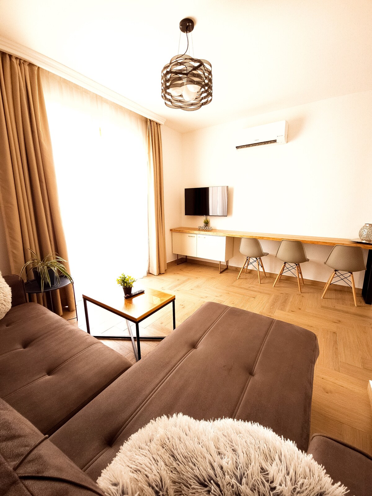 Dobrodošli u Monte View Apartman, oazu u srcu Ulcinja, koja odiše harmonijom, opuštenom elegancijom i predivnom energijom. Iz ljubavi prema prirodi, enterijer smo opremili prirodnim materijalima iz različitih okruženja širom sveta, kako bi stvorili osećaj topline, mira, dobrog raspoloženja i maksimalnog komfora i udobnosti. Ako tome dodamo magičan pogled na more, zalazak sunca, stari grad i panoramu celog grada, poželećete da ne napuštate naš apartman.
