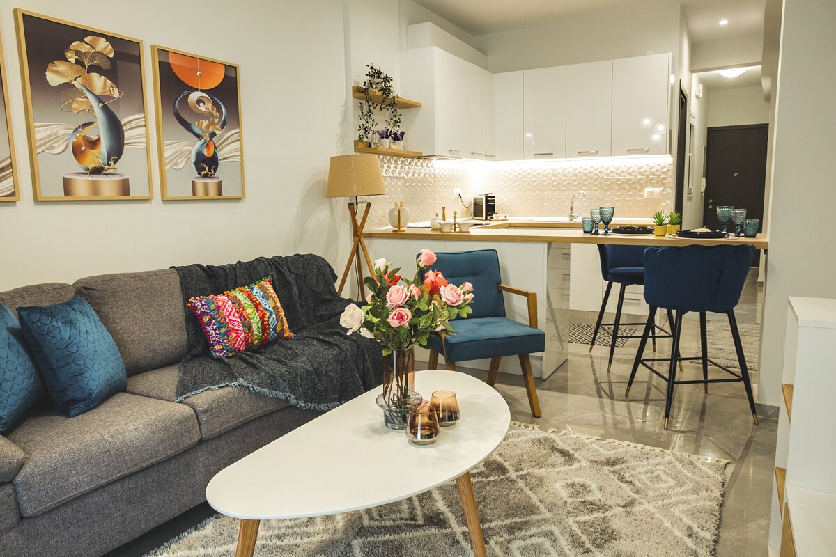 This unique apartment is located on the top floor of a new building with an unobstructed view of Thessaloniki and includes free parking space. The aparment is located in the 6th floor and guests have access using the elevator. Distance from city center is about 4k Distance from the airport is 15 km •amentities among others are:2 smart tvs (access to Netflix, Disney+ etc, using you own account) •Nespresso coffee machine •dishwasher, clothes washer and dryer •free parking space in the building