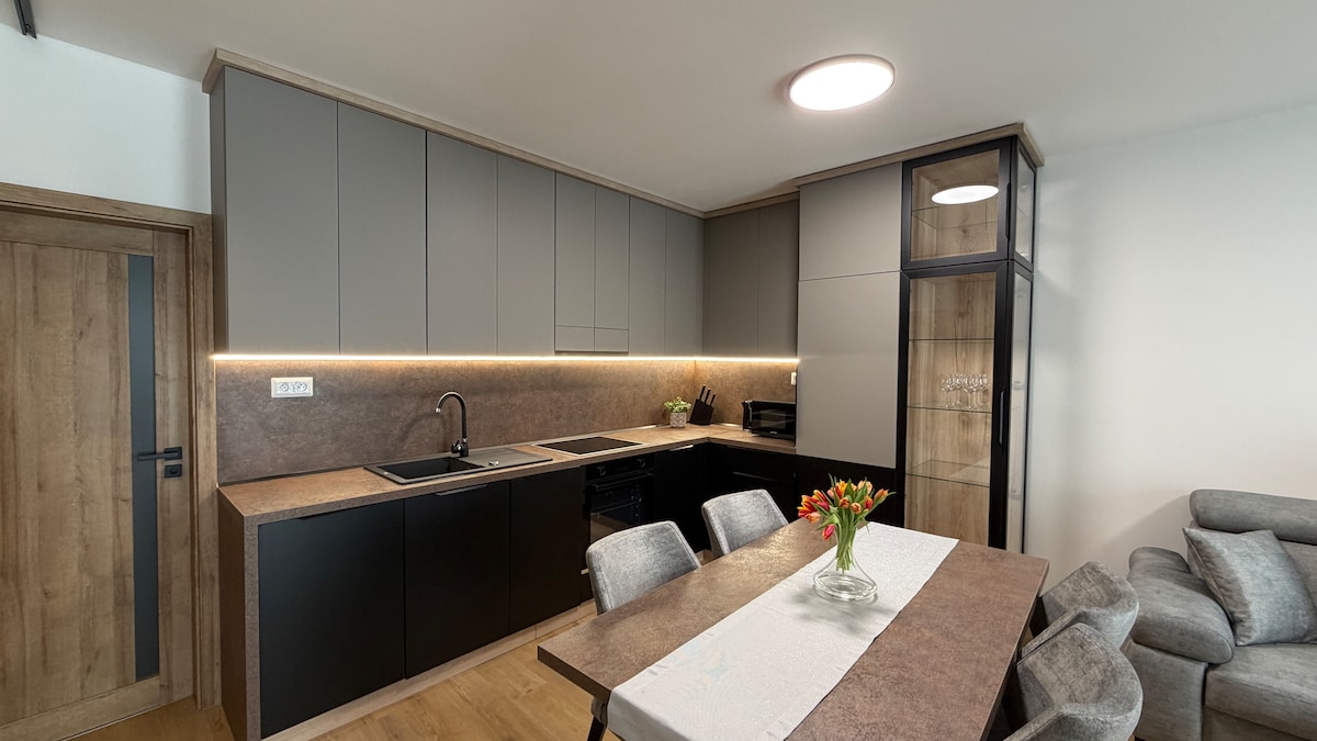 We cordially invite you to our new real estate gem - a unique apartment "SMRECEK", located near Zakopane, in Polana Pająkówka. The apartment is part of a new mountain estate with a breathtaking view of the Tatras. It has been furnished in a functional and modern way - in the PREMIUM standard. THE APARTMENT IS ALMOST NEW and has recently been rented to our guests. Everything smells new and fresh :)