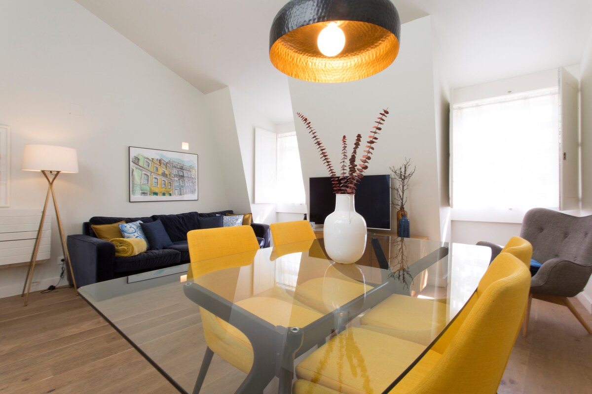 This trendy and stylish apartment is located in Baixa, Lisbon downtown, in a very central location and very close to Chiado. The decoration is upscale with beautiful paintings in the living room and comfortable setting throughout the entire flat with A/C. Recently refurbished, the building maintains the traditional character of Baixa, yet modern inside with two elevators. Just walk out from the building into the heart of Baixa where you can dine, shop and enjoy the best Lisbon has to offer!