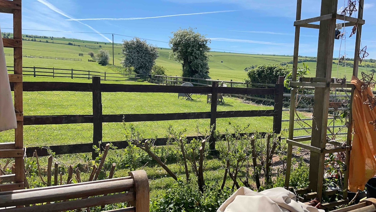 A light and airy spacious Shepherds hut set in a beautiful English garden adjacent to a paddock. Great for a couple wanting to get away for a short break in the countryside and ideal for visiting Stonehenge 15 mins. by car, Bath 50mins. and Salisbury 25 mins. A good stop over point for cyclists on the King Alfred’s way route. The friendly village of Tilshead is located at the heart of Salisbury Plain. Excellent Italian food available at the Rose and Crown Pub 50 yards walk away.