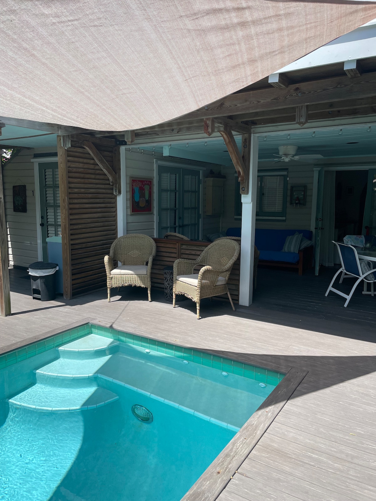 28-night minimum stay rental. Located in a neighborhood 3 blocks from Duval & a short walk or bike ride to Higgs Beach, Southernmost, bakeries, galleries, & Cuban coffee. Cottage has a fenced yard, pool, & two covered porches overlooking the front & back gardens. Our home is on the ground floor of the house. Our full-time tenant lives in a detached studio, accessed by a side entrance & stairs at the rear of the property. Airbnb guests have exclusive use of porches, pool, & deck.