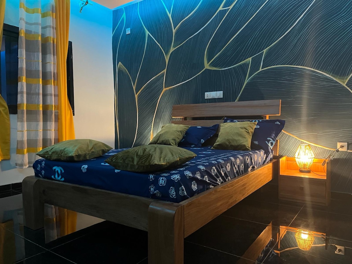 You'll love the stylish decor of this charming accommodation. Located in the Bonapriso district of Douala, it is clean, secure, close to places of relaxation and leisure. It is also 5 minutes from the city airport. Classic and elegant rooms, with contemporary details and refined decor. Very welcoming, it offers a feeling of timeless comfort created for special moments and a peaceful stay. The rooms are between 20 and 25 m2. Double bed, bathroom and private area