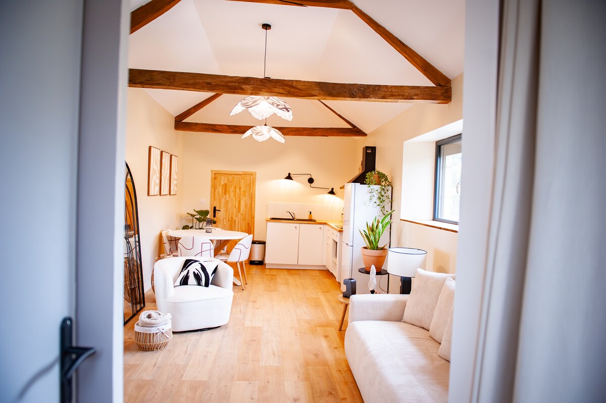 Welcome to Gîte Pierre & Modernité, an idyllic retreat blending rustic charm with contemporary comfort. Nestled in the heart of the countryside, this stone house offers a unique experience where tradition and modernity meet harmoniously. With its beautiful oak beams and modern interior, the cottage offers a spacious living room with a sofa bed and a fully equipped kitchen