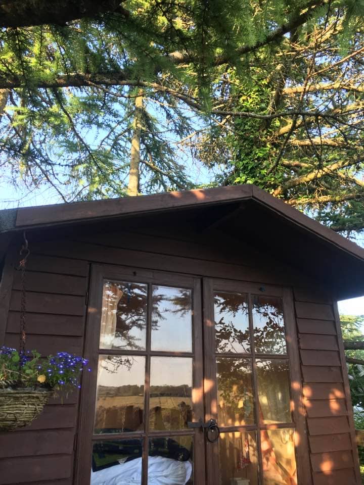 Brookside Cabin is a whimsical shepherd’s hut without wheels, in the countryside of Pembrokeshire in Wales. It is in the garden of an old stone cottage, next to a stream. The cabin’s interior is a small, warm, cosy wood lined space with hand painted wall art. There is a fire pit. A shower and toilet room is close by for your sole use.