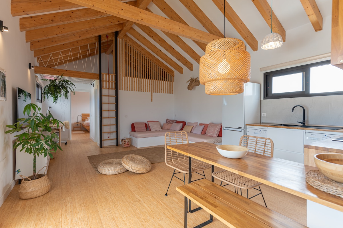 Experience the neuroarchitecture of this bioclimatic loft. Beach, ocean views, and fiber optic. 100 meters from Corralejo beach, we have created a natural habitat with views of the sea, Lobos, and Lanzarote. The design, based on the local climate, provides thermal comfort by taking advantage of environmental sources, as well as an aesthetic integration with the environment. All the necessary equipment in a quiet and residential environment, with nearby services (a few meters away and on foot).