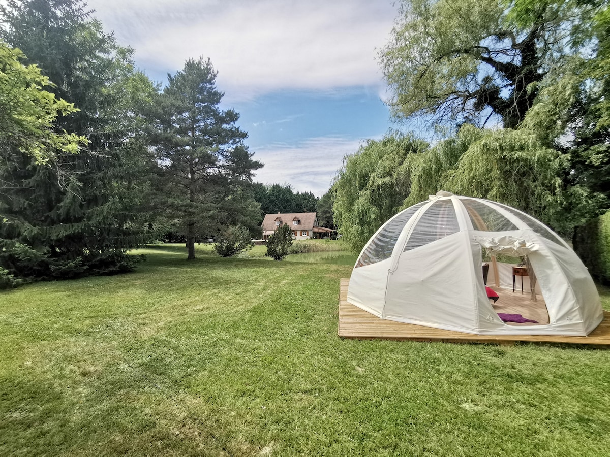Unusual bubble by the pond in a modern, refined decor with breakfast. Private bathroom nearby and toilet in the guest house. Electricity in the bubble for laptop, PC... and heating Heated 50 m2 swimming pool in the park from May to September. Garden lounge deckchairs A real relaxing moment for lovers