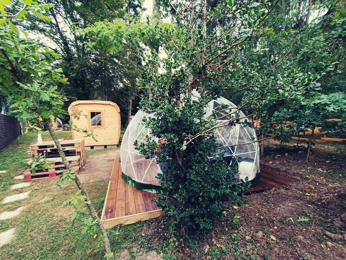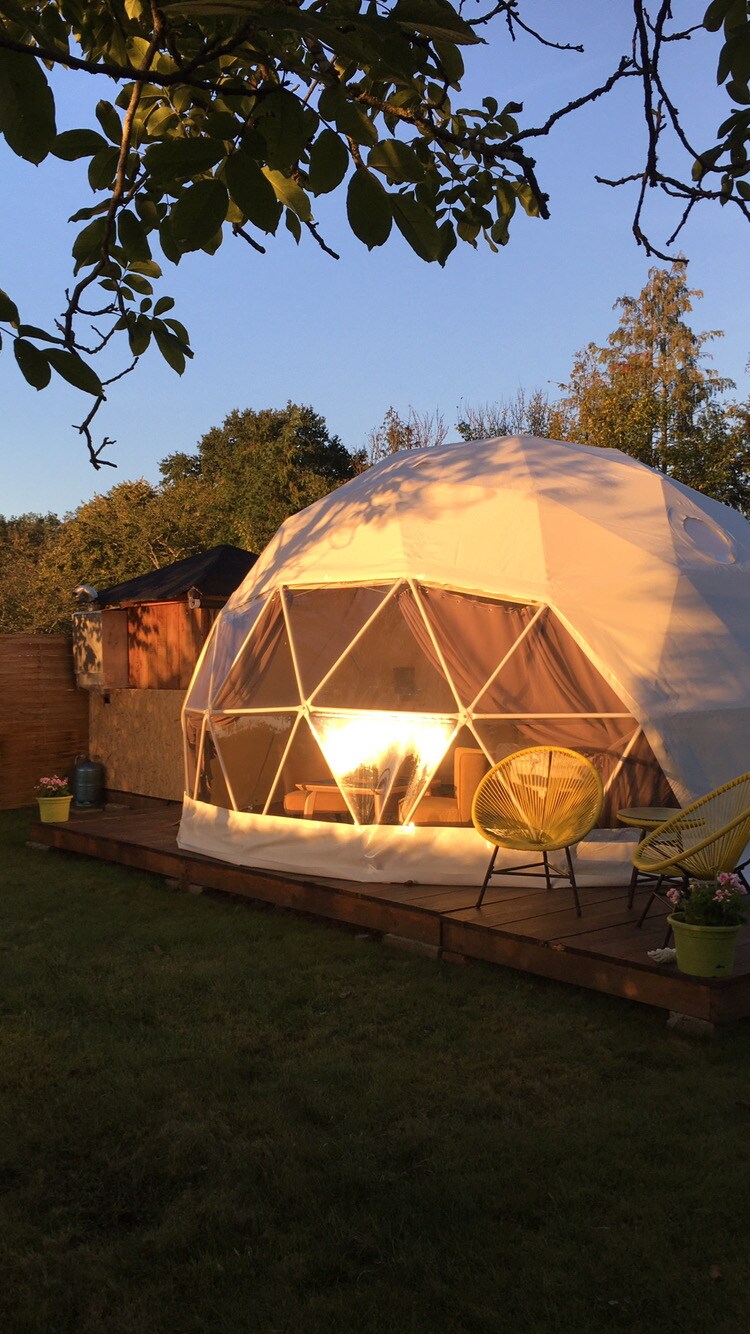 Venez vivre une expérience unique. Observer les étoiles aux chants des oiseaux nocturnes. Notre dôme géodésique de luxe Zen est située dans un cadre écologique et nature. Salle de bains et toilettes sèches privées intégrées au logement. Petit déjeuner maison bio livre à votre porte! *Possibilité de privatiser notre Bain Nordique chauffé au poêle à bois à 38°. Tarif: 15 euros par personne , pour 1h de pure détente. Chaque session de bain nordique est privative.