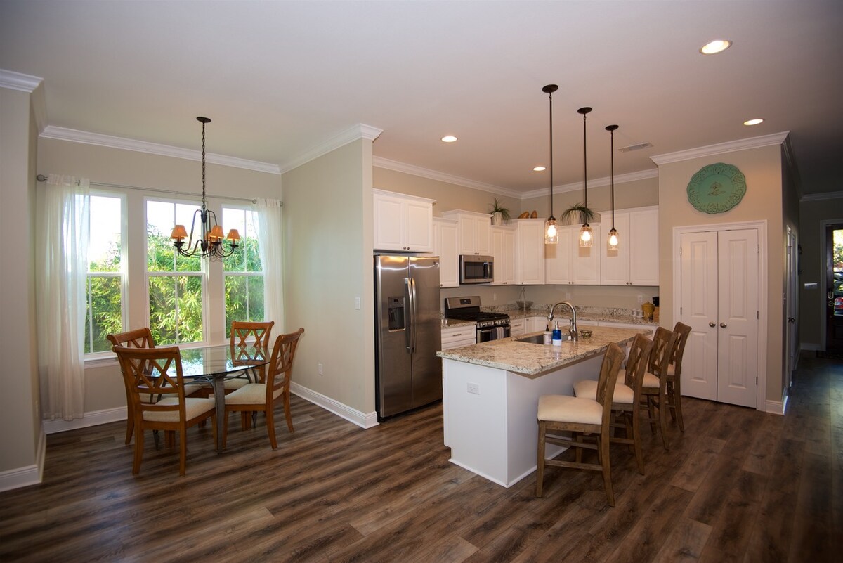 THE GULF COAST RETREAT Beautiful 1-story home (built 2017), no stairs, just 500 yards away from the white, sandy beaches of the gulf coast. Spacious living area with dining area & modern kitchen w/ granite countertops. 10-ft ceilings for comfort. Privacy fence & rear porch with seating and grill. High-speed wireless internet. Suitable for short-term stays, as well as for snowbirds; up to 4 adults, 3 children. Positive feedback from AirBnB is important. For special requests contact host.