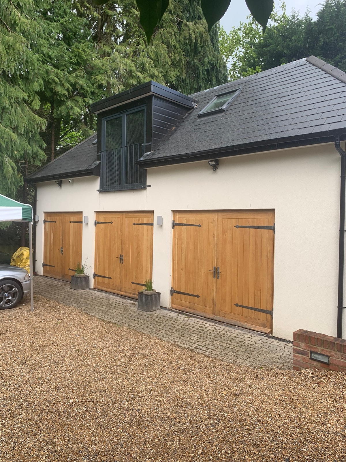 Delightful detached barn crafted from French oak in a peaceful private lane on a gated country estate. Luxuriously appointed with full facilities for a short break or longer stay. Air Con. Free EV charging point. Many public footpaths close by. Local shops are only a 10 minutes stroll. Gastro pubs, restaurants and independent shops within easy walking distance. A short drive from M25 (J11). Fast rail links to London from Woking. LGBTQ+ friendly. Friendly Spaniel and Siamese cat on site.