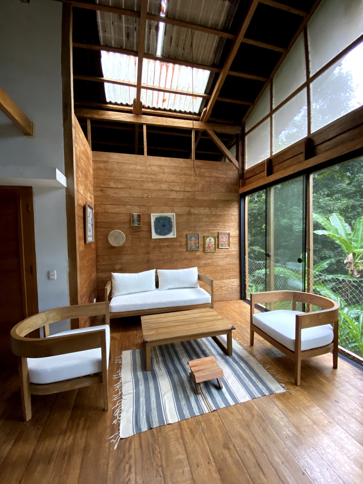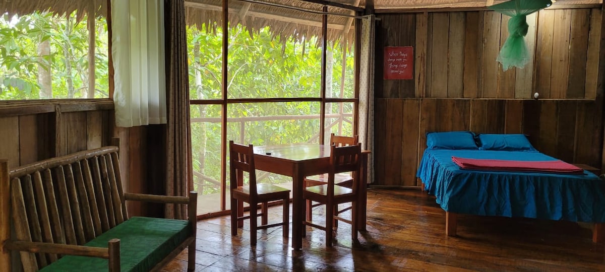 Beutiful house crafted entirely from natural materials on a sloopy hill overlooking small lagoon in the jungle..WIFI.. 220V ..spring matrace Short walking distance access to shower and bathroom .. shared chill area indoor .. gym .. Maloca with indoor fire pit .. terrace with 9000L swiming pool (natural bit of leaves and algae) Located out of town in jungle .. access to town walking or mototaxi 10 minuts You can see monkeys spiders and other jungle creatures around here in its natural habitat