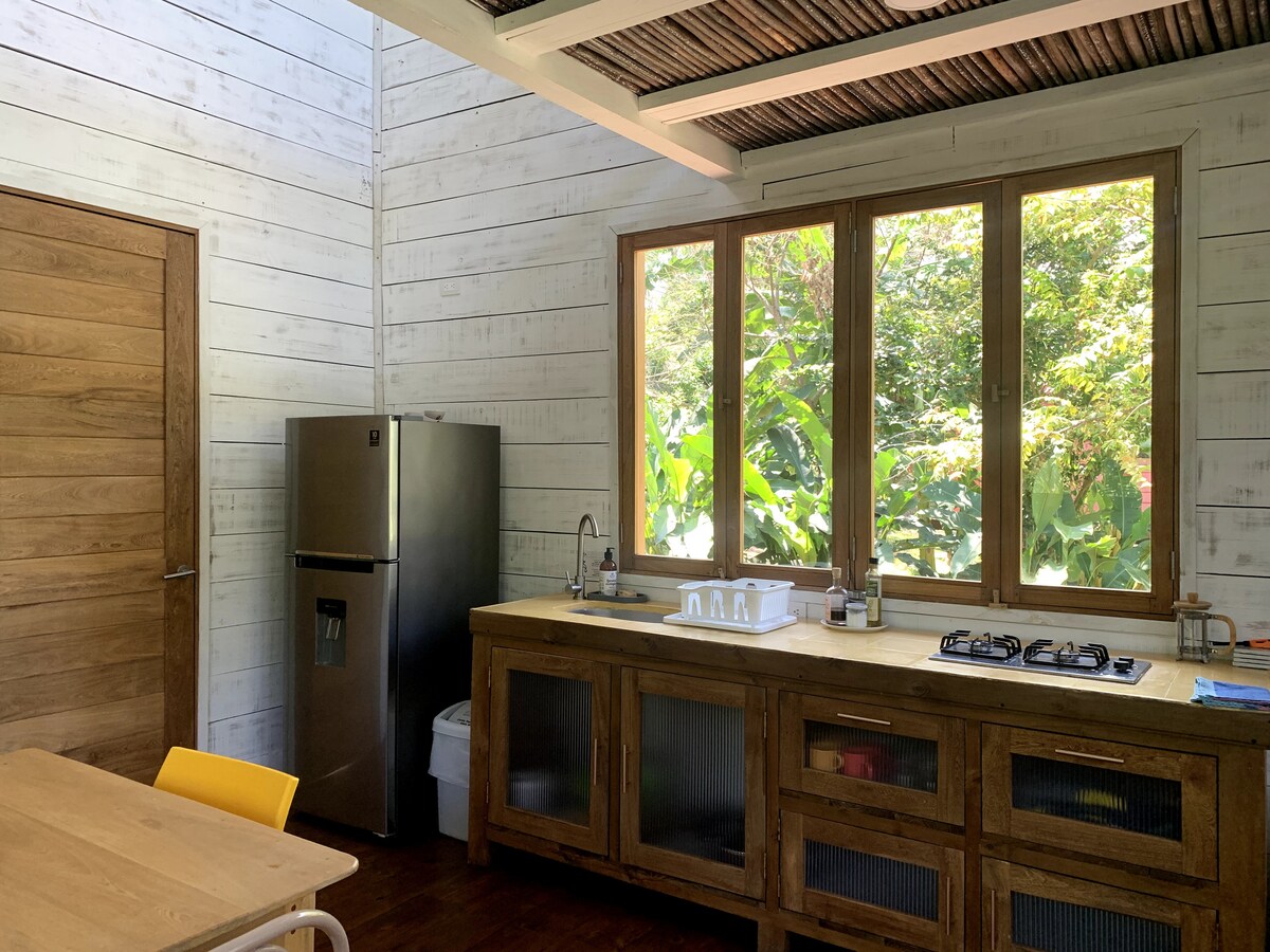 Jungle Casa privada para 1 a 3 personas, elevada sobre la selva, ámplia terraza en el segundo piso y vista al MAR. Estamos a 2 min en moto del Parque Tayrona (Zaino). Zona muy tranquila, lejos del ruido de la vía, casa autosostenible pero cómoda, energía solar, fuera de la red, Wifi Starlink. Somos anfitriones en sitio y te ayudamos con tours, actividades, transporte, domicillios y secretos locales. Incluye libre acceso a las playas más cercanas y hermosas de la zona (11 min caminando).