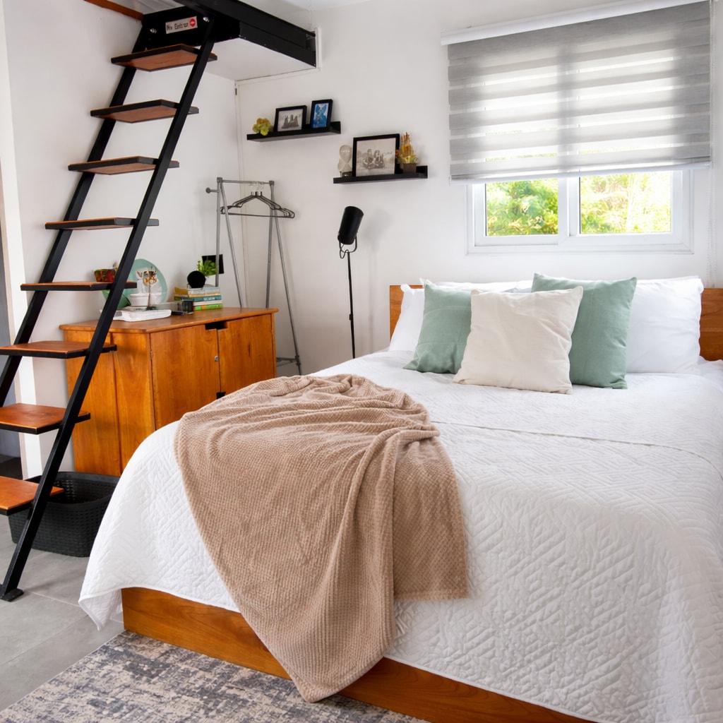 At CASA EJECUTIVA, this work-ready studio offers comfort and practicality for remote work. Enjoy spectacular views from the king bed, relax, and take in the sights of the town. A comfortable desk, fast internet, solar panels, a battery bank, and backup water ensure you stay connected and powered during outages. The fully equipped kitchen completes the space, providing everything needed for both work and leisure.