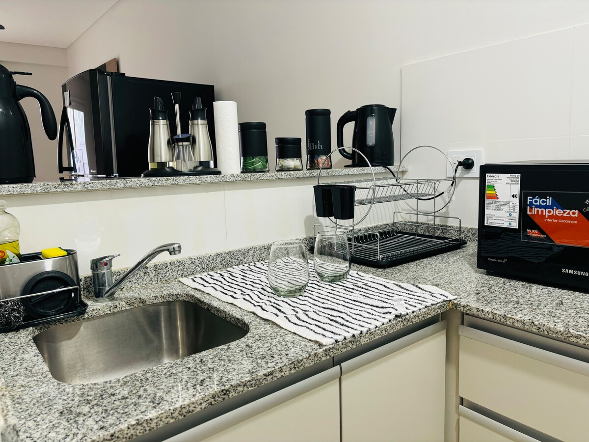 We invite you to enjoy a beautiful stay in this modern studio apartment. Ideal for couples or solo travelers. Located in the center, it offers proximity to the main tourist spots and entertainment areas. Just 8 minutes by car from the Estadio Único, 1 minute walk from Parque Aguirre, 2 minutes walk from the bars of Avenida Roca and 5 blocks from the main square. Ideal for those who want to explore the city on foot and enjoy the local cuisine, bars and culture.