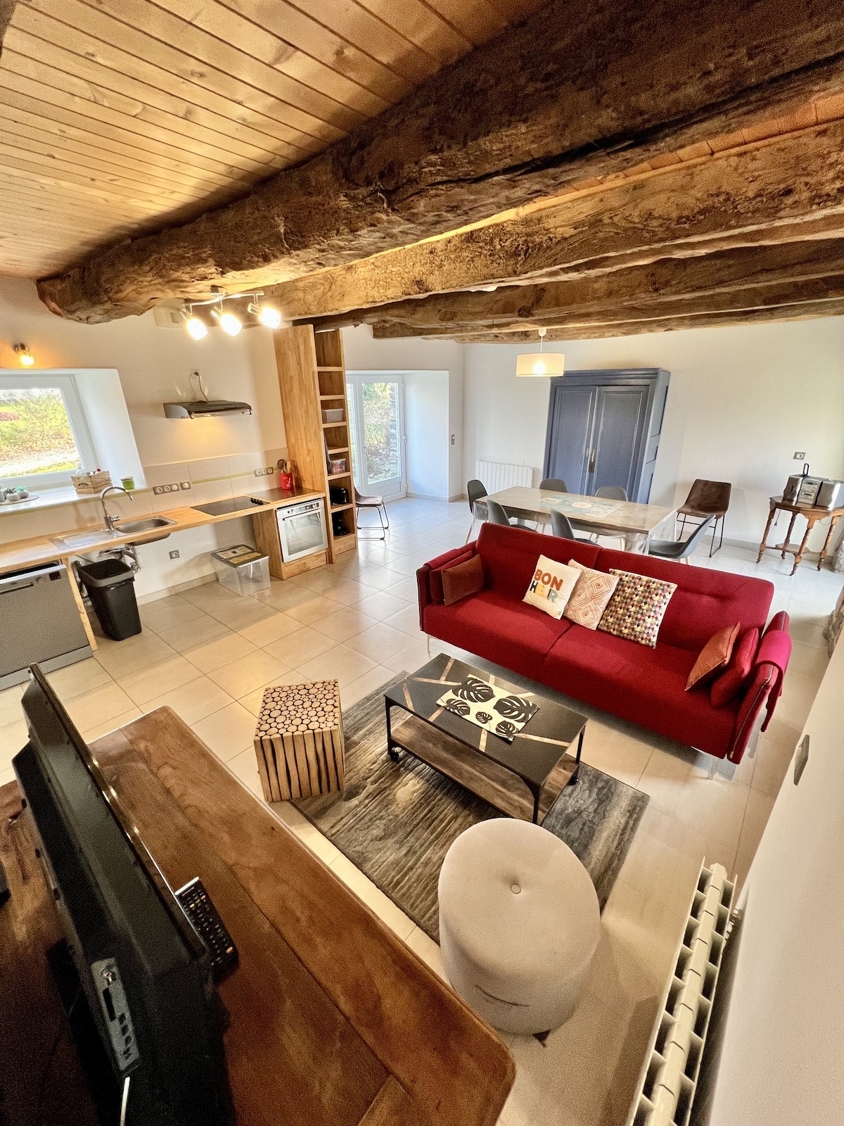We will be delighted to host you in our old mill located in the heart of the countryside in a preserved environment. Detached house, living room of 45 m2 approx. with equipped kitchen and living room with TV. Wi-Fi. Upstairs, 1 bedroom on mezzanine with 1 double bed + 1 sofa bed that can offer two extra beds. Baby bed on request. Bathroom with bathtub and toilet. Outside, a pleasant garden allows you to enjoy the sun and the river. Parking Linens provided