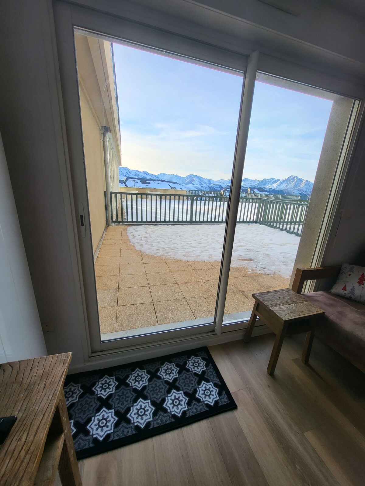 70 m2 apartment Panoramic view of the Pyrenees with balcony and terrace The "Le ROYAL" residence offers a heated indoor pool and gym, close to all sights and amenities (mountain grocery store, supermarket, restaurant, bread, equipment rental...). On the 3rd floor with elevator departure from the slopes 400 m on foot flat path or by free shuttle in front of the residence and SKI RETURN ON FOOT with slope 007 Close to the tourist office