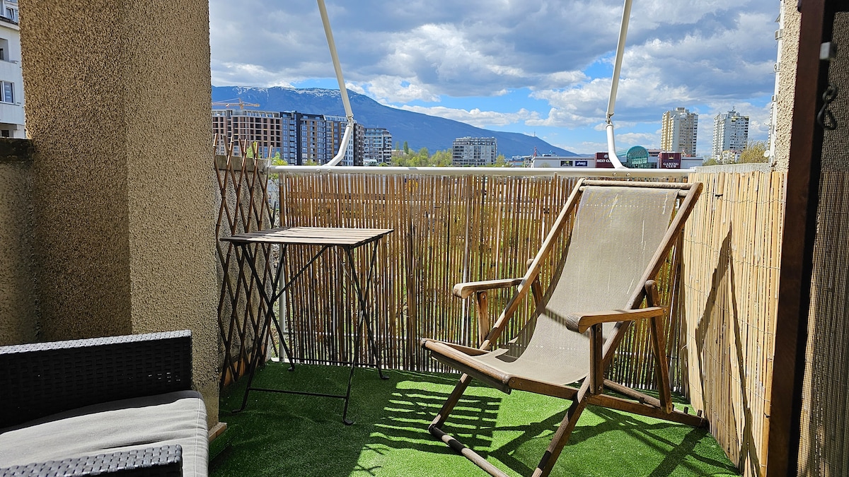 A brand new inviting apartment with a great view of Vitosha mountain. Furnished in a contemporary interior style, which makes it feels airy and spacious. The apartment is located in a private complex, on the 9th floor. A cozy and comfortable place! Just 8min walk from Inter Expo Subway Station and 10min away from the city center by car. It is also convenient to get to the airport, both by subway and taxi.