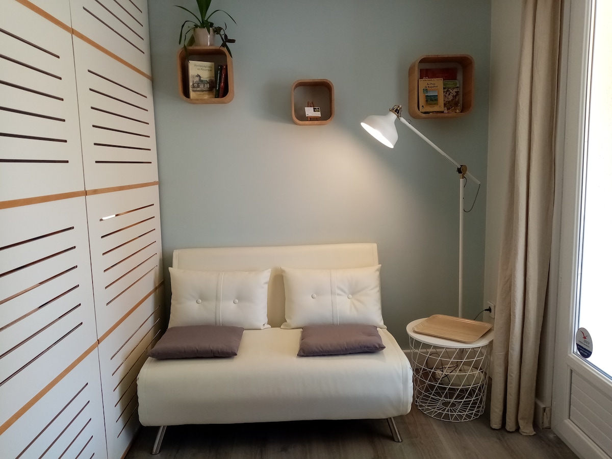 In a quiet and green environment, this friendly two-room independent terrace invites serenity. Located on the ground floor of the large farmhouse, it is a small quiet nest open to nature, turning its back on the discreet movements of the property. The song of the river, the different places in the garden invite rest and meditation as much as swimming and hiking. A shaded parking space is reserved for it.