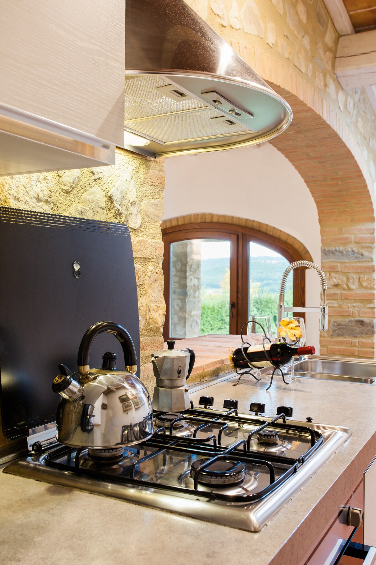 Spend a holiday in the heart of the Tuscan countryside in this cozy stone house with terracotta floors and beamed ceilings in solid oak, furnished with paintings of author , equipped with all comforts. Enjoy yourself by swimming in the large infinity pool (18m X 9m, open from May 1st to October 15th for guests of Stone house use only) or relax in an armchair under the loggia, tasting a glass of Chianti wine in front of the rolling hills of vineyards, olive groves, woods and medieval villages.