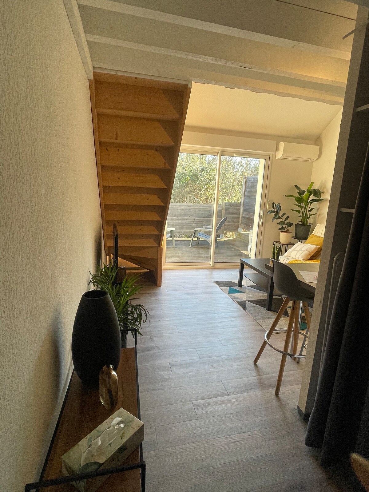 Espace refait à neuf, 35 m2 : - grande chambre / espace de vie - cuisine équipée séparée attenante - salle de douche + wc Maison résidentielle au calme, près du centre ville, supermarché. Votre espace est au rez - de - chaussée, nous vivons à l'étage. La chambre donne sur une grande terrasse à votre disposition pour les beaux jours. Café - thé - infusions à disposition. Connexion WiFi NON FUMEUR- merci d'aller sur la terrasse. Nous serons ravis de vous conseiller pendant votre séjour!