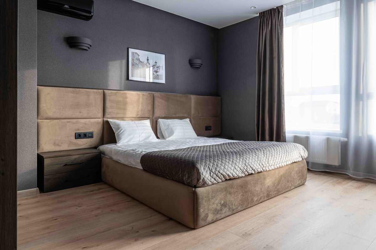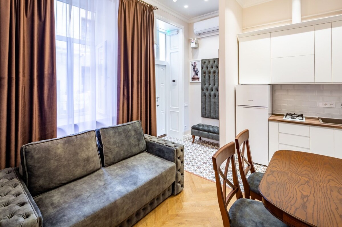 Нові дизайнерські апартаменти класу люкс (35m2) розташовані у самому серці історичного центру біля Львівської Національної Опери. Тут ви знайдете все необхідне для комфортного розміщення до 4х осіб. Безкоштовний Wi-Fi, кондиціонер, Smart TVs, ліжко queen size (160x200) у спальні та комфортабельне диван-ліжко у вітальні. Повністю обладнана кухня та ванна кімната із пральною машиною. Безкоштовна вулична парковка біля дому, безліч розваг та пам'яток архітектури в пішохідній доступності.