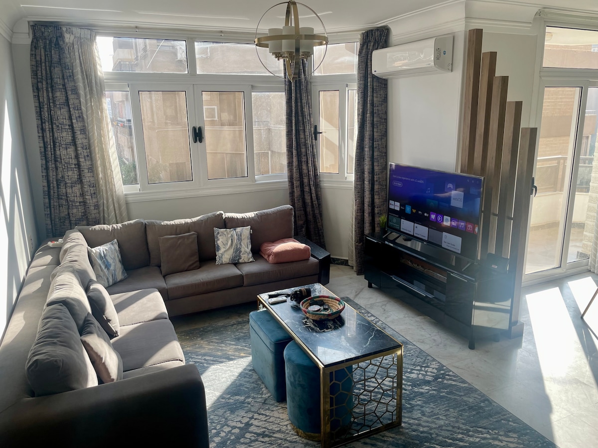 Step into Cairo's magic! ✨Experience "Arabian Nights" charm in this modern 2-bedroom apartment, nestled within Maadi's secure Future compound. Unwind on private balconies, relax in the sun-kissed living area, or whip up meals in the fully equipped kitchen. ️ Two well-appointed bedrooms invite restful slumber, each with a comfy beds and balcony access. Explore vibrant Maadi, relish Nile breezes, and discover Cairo's rich tapestry, all from your serene oasis. 24/7 security, & workspace await!