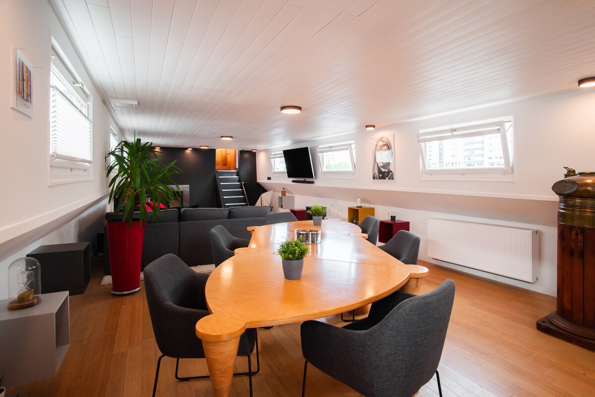 Located in the heart of Liège, Aloha is perfect for a stay with friends, as a couple, with family and even for a business meeting in the area. You have to spend at least one night in your life on a barge, it's absolute happiness Moored on the banks of the Meuse, Aloha is a 38.9-meter-long Freycinet-type barge. Built in 1923, it was renovated in 2020 to make it a luxurious and very comfortable historic home