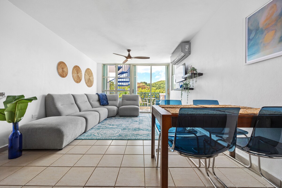Mar Azul Retreat is a two story, 3-bedroom penthouse with beautiful views of Culebra, Vieques, Palomino, and Medio Mundo. Next to Puerto del Rey Marina, Machos Beach, Roosevelt Roads, and Las Croabas. El Yunque’s waterfalls and hiking trails are minutes away. Enjoy a large terrace for meals with a view, a private balcony for sunrise coffee, and stylish, renovated interiors. Perfect for anyone looking for relaxing time.