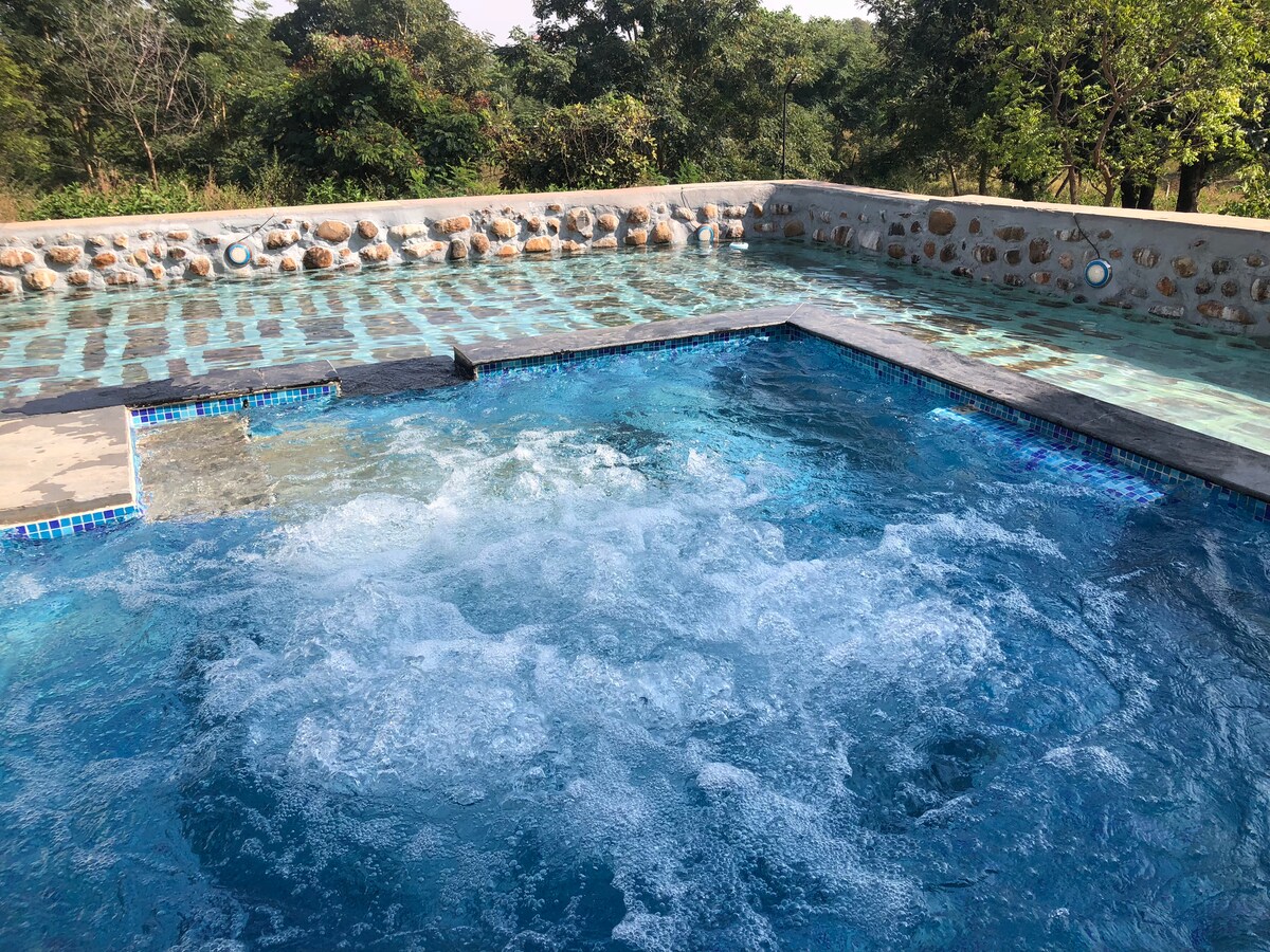 Relax with the whole family & friends at this peaceful place to stay.Private hill-view pool villa with lawn, nature trek, ancient Shiva temple, close to Bambleshwari Mata (Dongargarh) and Nagzira Wildlife Sanctuary. Ideal for weekend getaways, spiritual trips, family retreats & small celebrations. THE VILLA • 2BHK private villa • Up to 6 guests • Clean bathrooms with hot water • Peaceful interiors POOL & LAWN • Private swimming pool • 5000 sqft open lawn • Hill view backdrop