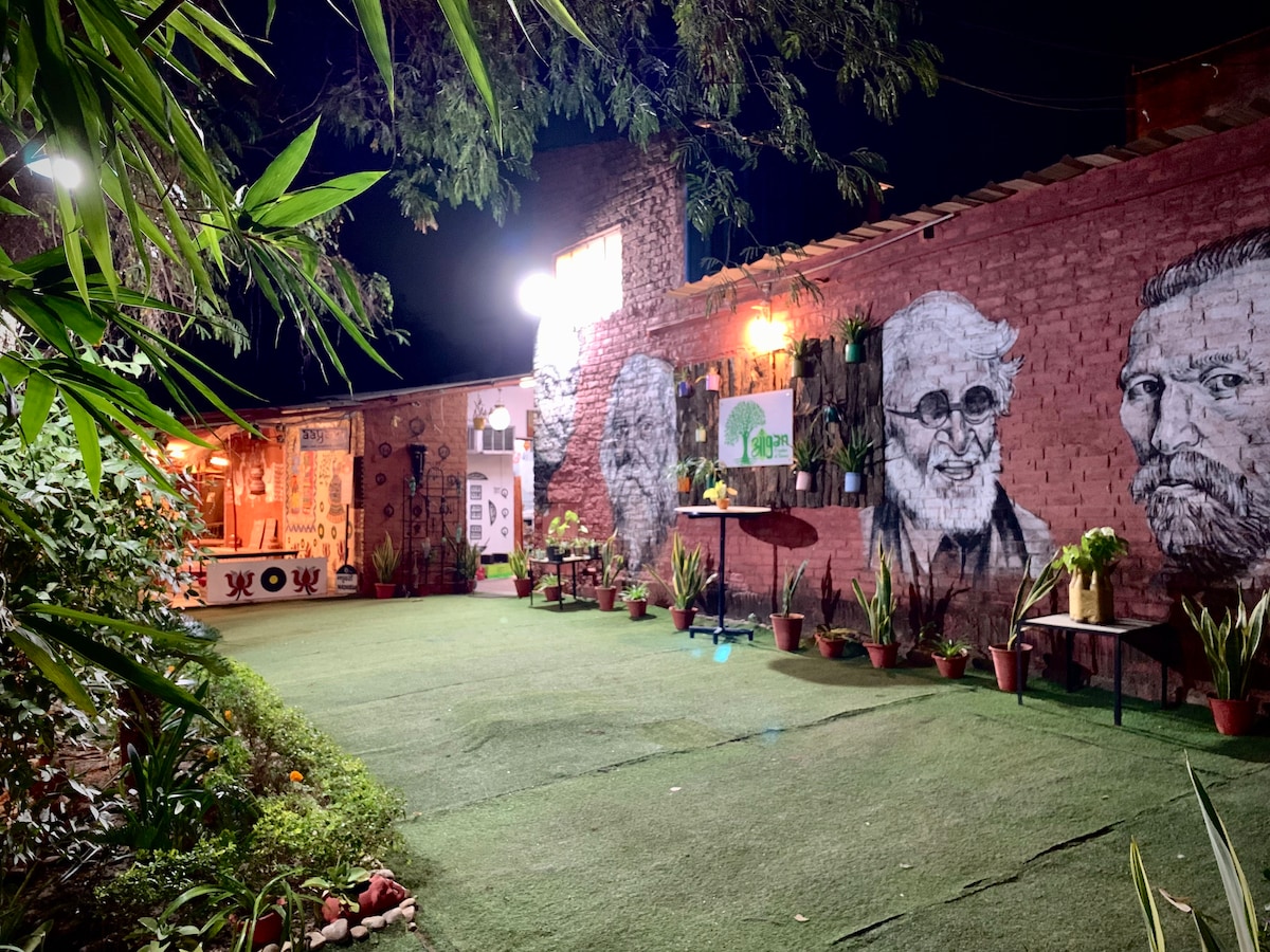 A unique space that breaths and exhales art invites you to experience peacefulness, celebrate solitude and rejuvenate oneself. Centrally located in 'Pink City - Jaipur’ behind Kalaneri Art Gallery amidst nature, this artistic abode adorns various dimensions of Indian art sustainably handcrafted for creative minds, be it individuals, groups or families. The residency has a private kitchen and garden space with a patio with different Indian folk and tribal art embellished on walls and furniture.