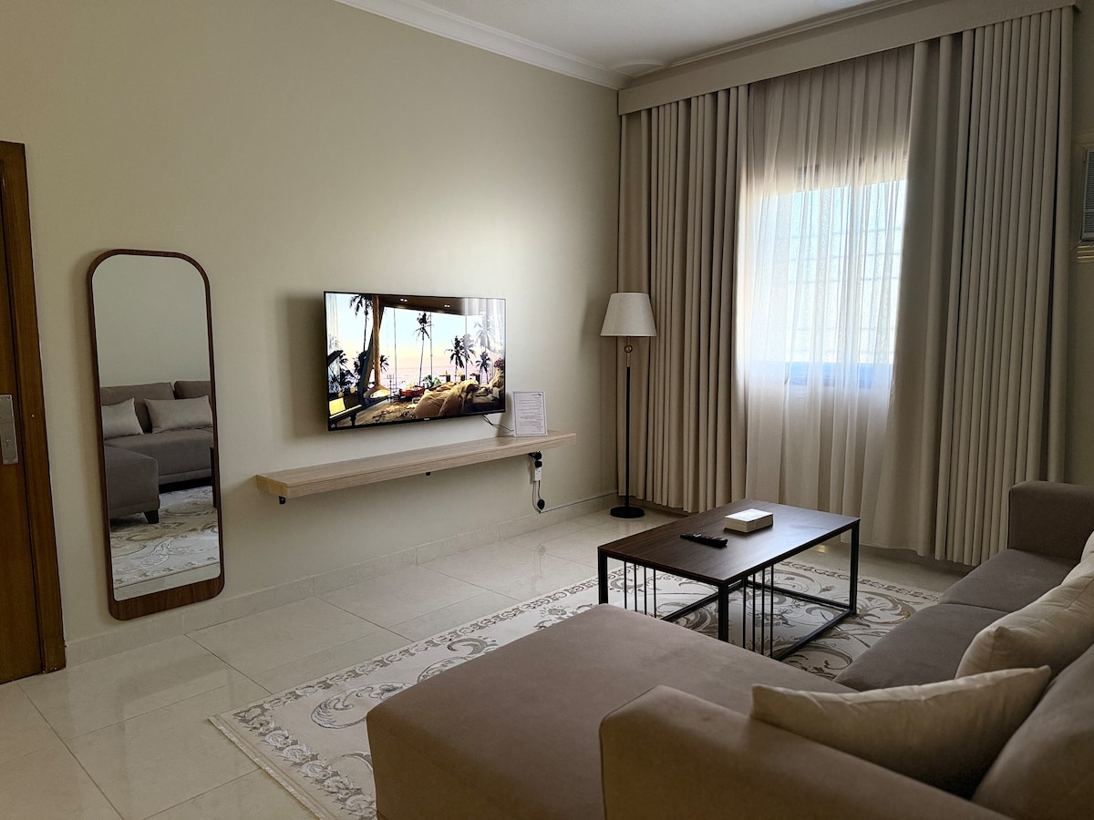 A quiet apartment consisting of a luxurious bedroom, a living room, a full kitchen to cook your favorite meals, and a fully equipped bathroom - 5 minutes by car from the Prophet's Mosque, 3 minutes by car from Quba Mosque, and very close to Quba Walkway and Juma Mosque 🕌 - All services, restaurants and shops are available 24/7 - A sofa for relaxing - 65-inch smart screen connected to Wi-Fi to provide you with a pleasant viewing experience with the family - The smart screen has all the apps Netflix and YouTube Welcome to our new home💜 We are available at your service throughout the stay