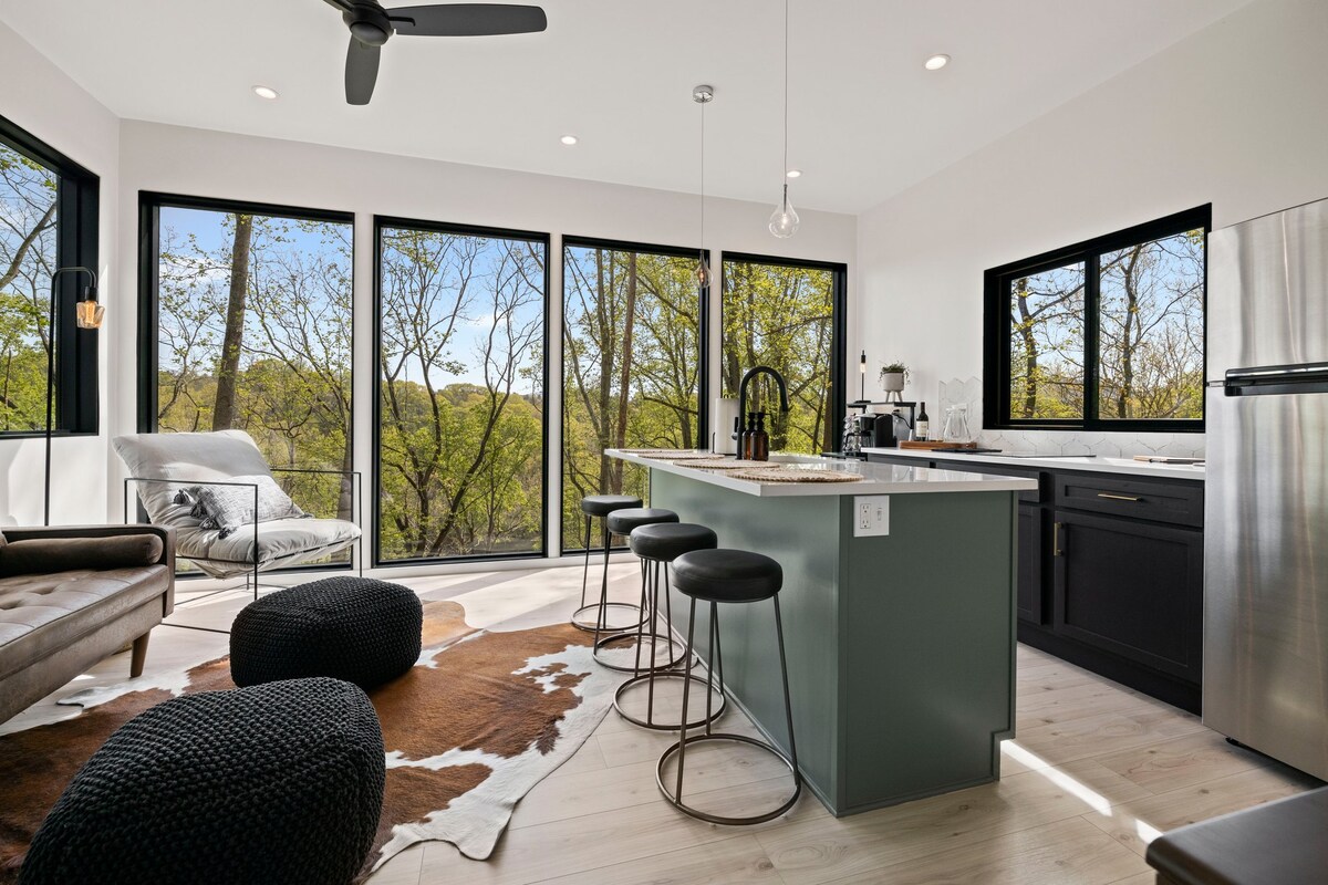 The Arcadia Cabin is a 2-bedroom modern cabin with high ceilings, hardwood floors, fast WiFi and lots of light just 15 minutes from downtown Asheville and within minutes of Weaverville and several popular wedding venues. The private deck is spacious and designed to make the most of outdoor relaxation on our wooded hilltop. Outdoor activities and excellent dining choices all within minutes of Farmside Village.