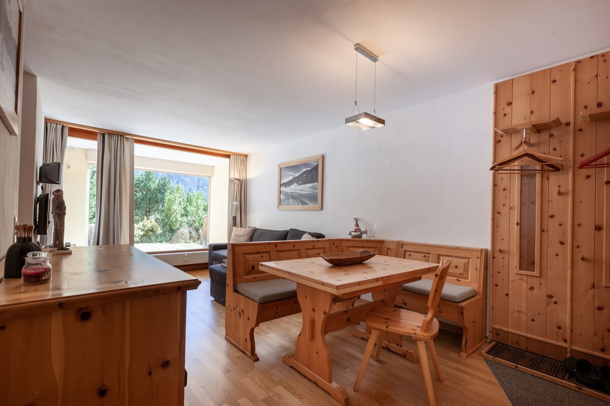 In the enchanting village of La Punt-Chamues-ch we rent a lovely studio apartment of generous size. The studio is tastefully furnished in Engadin style and enjoys an open view of Piz Mezzaun. Ideal for a skiing holiday or for venturing out on the countless walks the Engadine has to offer. The flat is also located 150 meters from the start of the Marathon's cross-country run. In the immediate vicinity you will also find post office, bank, sport shop, a supermarket and many other facilities.