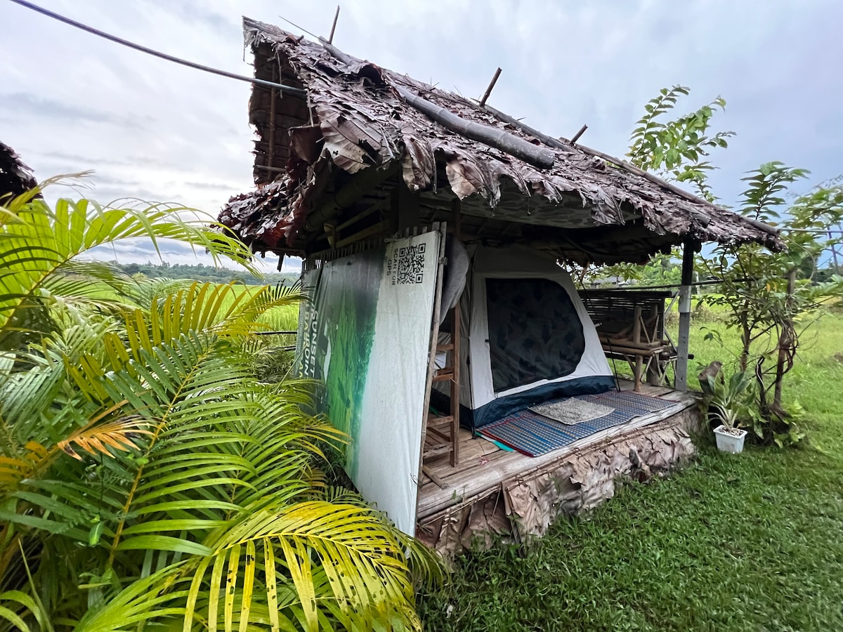 Glamping surrounded by nature with views of rice fields and mountains — complete with a bed, electricity, and hot water