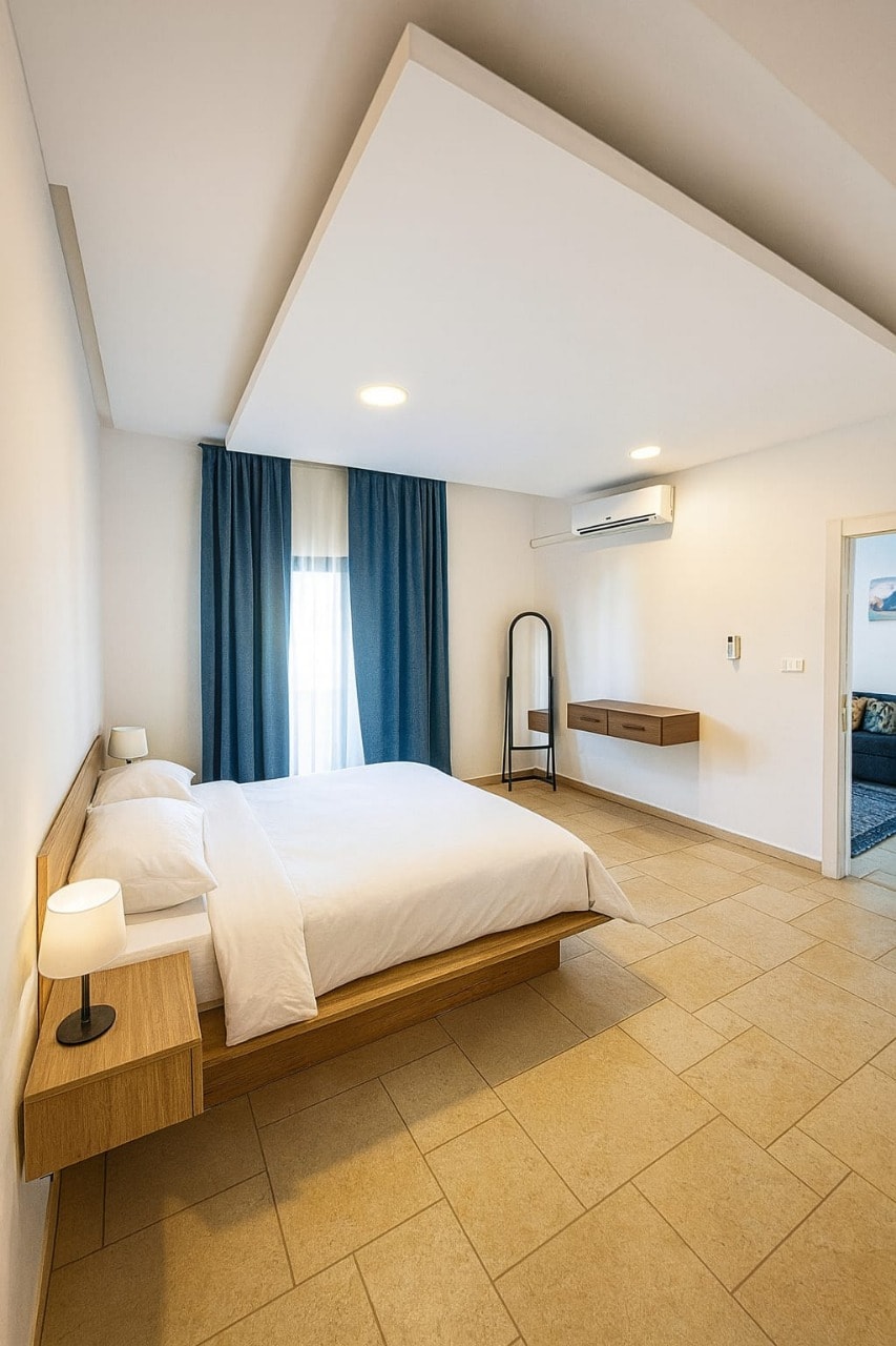 Enjoy a high-end hotel stay in the heart of Amman, with a sophisticated and very comfortable modern design. The apartment has an elegant living room with a 65-inch smart screen, a fully equipped kitchen, and two spacious bedrooms, one with a king-size bed and the other with two perfect single beds. There is a private outdoor terrace for seating, with high-speed internet, and free parking close to the location. The apartment is located in the lively Al-Aqsa suburb, near the Ministry of Health, restaurants, cafes, and markets, and is minutes away from the 7th roundabout and Al-Madina Street. Ideal location for families or visitors in the center of Amman.