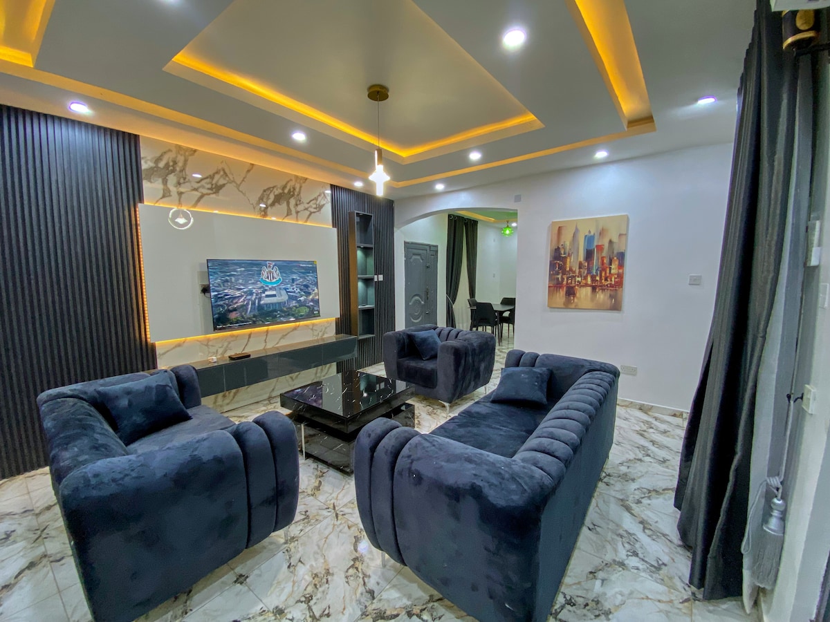 In this home, We’ve passionately created that perfect Indoor/Outdoor experience. It comes complete with a Pool, Gazebo, Laundry area and more. Inside is a living area with 65inch smart Tv and leather settees. Your bedrooms come ensuite with modern bathrooms and high water pressure. The kitchen comes with a heat extractor, and burners. Our WiFi is wired and Super fast. Power is 24/7. At your service is a Security guard and Porter.