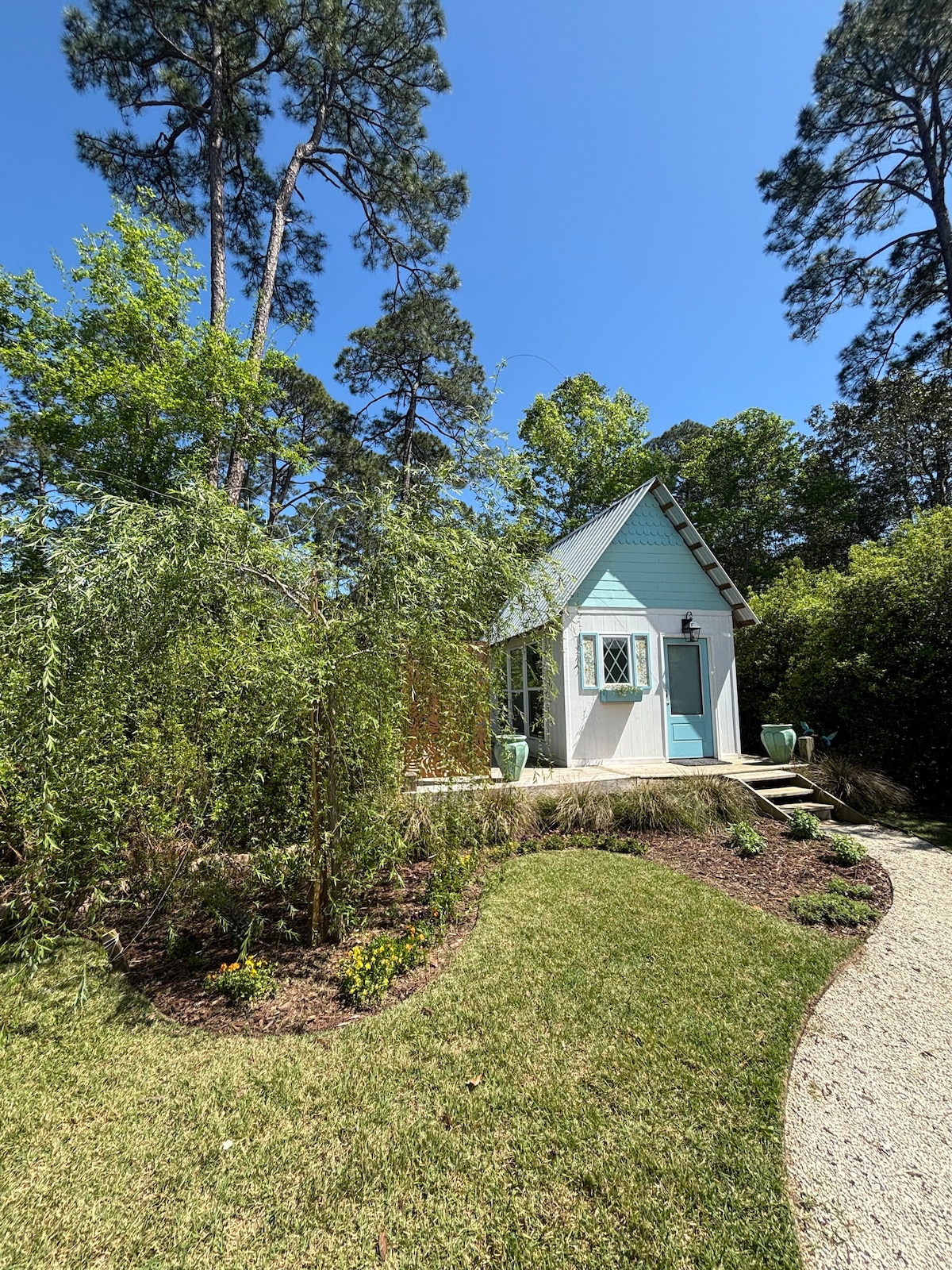 SHE's, "Fun Cottage" is located in the quaint and picturesque Bon Secour fishing village area just north of Gulf Shores, AL and is well suited for a couples getaway. It is strictly set up for a couple that are 25 years of age or older plus children are not allowed. This quiet and historic neighborhood is close to all the beaches, shopping and restaurants. The newly constructed 480 sq ft secluded "Fun Cottage" has lots of unique features to explore and enjoy. Outdoor shower and extras