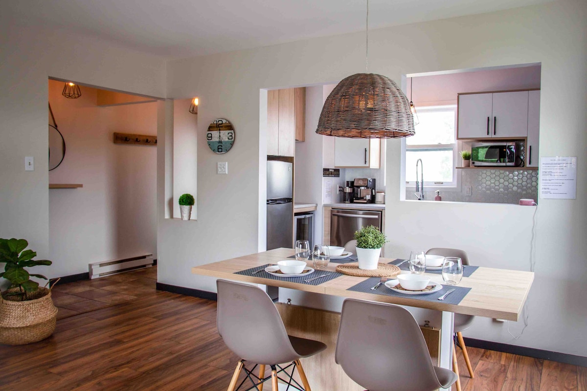 # establishment CITQ :235620 STRICT CLEANING BETWEEN EACH RESERVATION AGAINST COVID 19. INSTALLATIONS FOR TELEWORK. Recently renovated two-storey condo located near the beach of the townships, a few steps from downtown Magog and Mount Orford. Two bedrooms with queen size bed. Full kitchen and one bathroom with washer-dryer. Internet and cable TV is also available. Several books and board games. You can easily stay up to 6 people.