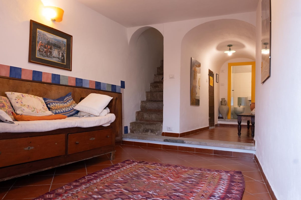 Casa Melograno is a three-story house with a charming small garden. The ground floor features a spacious kitchen, while the first floor includes a living room (which can also serve as a bedroom) and a bathroom. The bedroom on the second floor is accessible by a ladder. Casa Melograno has been tastefully renovated by us. Please note, it is not suitable for young children under 6 years old due to the lack of a banister on the stairs and the ladder leading to the top-floor bedroom.