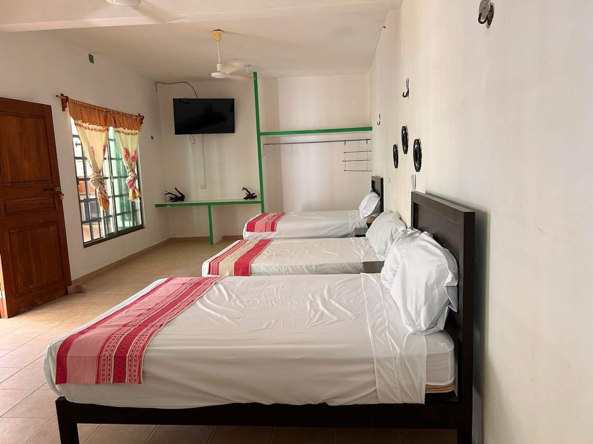 Disfruta de una estancia relajante en esta cómoda y luminosa habitación ya sea para una escapada romántica o unas vacaciones relajadas. Ubicada a solo 10 minutos de la playa, Cuenta con dos camas confortables, aire acondicionado y Wi-Fi rápido. El espacio ofrece un ambiente tranquilo, perfecto para desconectar después de un día de playa. Tendrás acceso a baño privado, áreas comunes limpias y bien cuidadas, y recomendaciones locales para disfrutar de restaurantes, paseos y actividades cercanas.